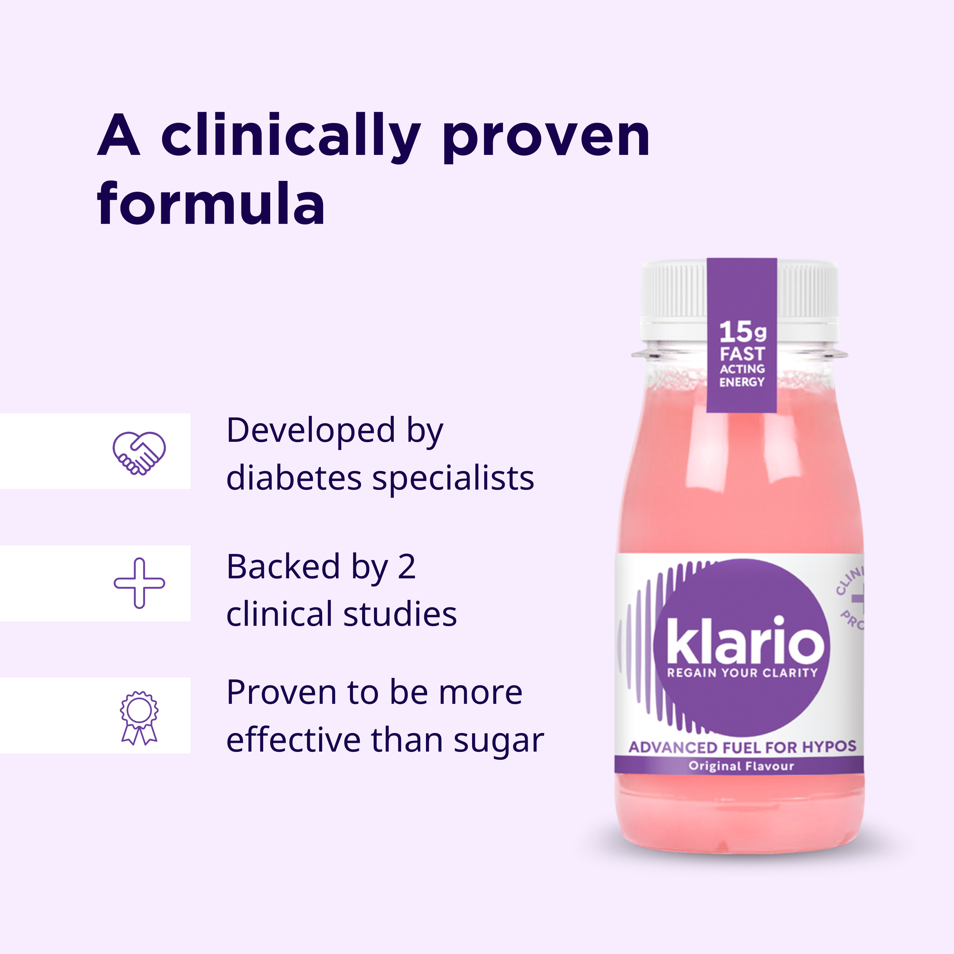 Klario contains 15g fast-acting carbohydrates and 10g adaptive energy, your brain’s preferred source of fuel during a hypo. Klario delivers an immediate dose of fast, efficient energy in an easy-to-carry liquid shot, making it easy to manage hypos on the go. Caffeine free, gluten free and suitable for vegans.